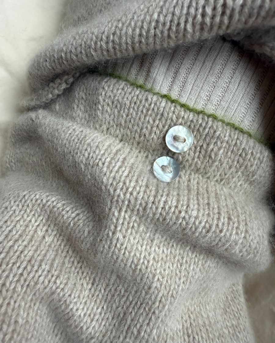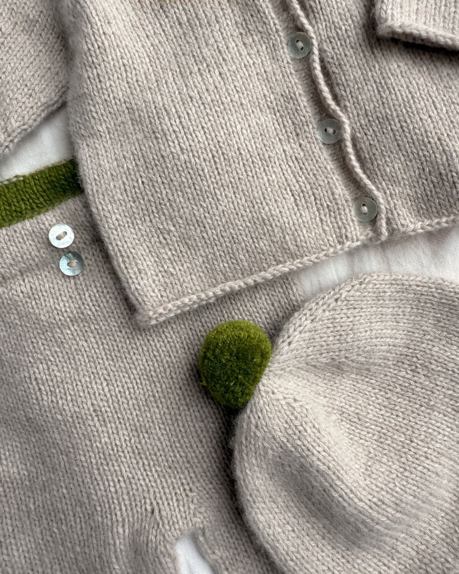 Det beige Cleo Baby Set er strikket i Cashmere fra Sandnes Garn i farverne Beige melange [3021] og Matcha [9564].