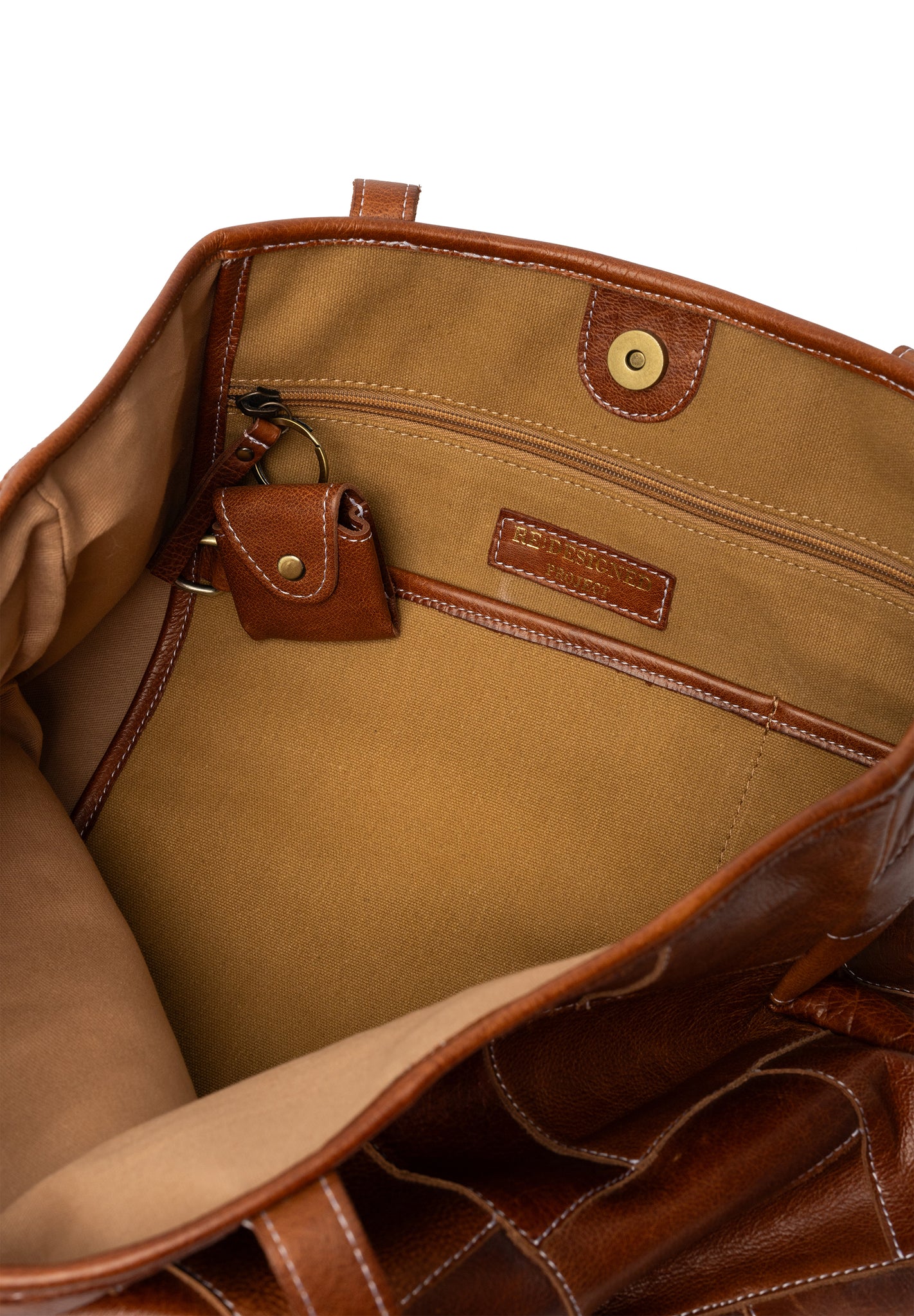 Det kasserede læder skæres i mindre kvadrater og sys omhyggeligt sammen, hvilket resulterer i en unik og smuk projekttaske, hvor ikke to er ens."