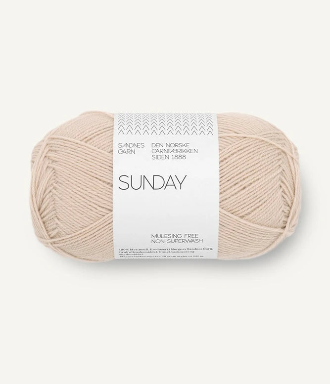 Sunday er Sandes' tyndeste variant af 100 % merinould og er det perfekte basisgarn: et tyndt ikke-superwash behandlet garn som kan strikkes med enkel og dobbelt tråd. Eller strikkes sammen med Tynn Silk Mohair.