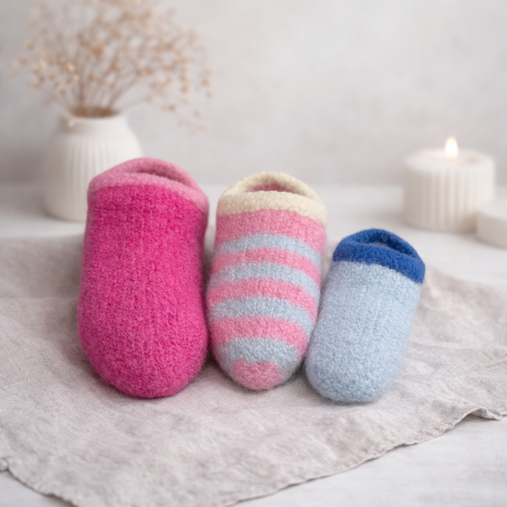 Disse klassiske filtede sutsko strikkes oppefra og ned med hæl i vendepinde og en smuk I-cord-kant. Efterfølgende filtes de i vaskemaskinen, hvilket giver en tæt, varm og formstabil hjemmesko med perfekt pasform. Modellen er enkel at strikke og egner sig både til øvede begyndere og erfarne strikkere.